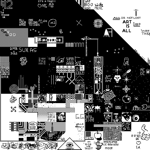 Notes: Most software plays these animated GIF files a bit slowly because they contain thousands of frames. The Linux program xanim plays them well. The whole (time-lapse) retrospective history of the work can be exhibited as a projection. [Help]